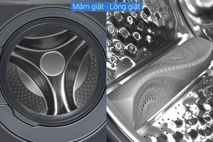 - Lồng giặt bằng thép không gỉ có độ bền cao, giúp tăng hiệu quả giặt sạch và giảm ma sát với quần áo.