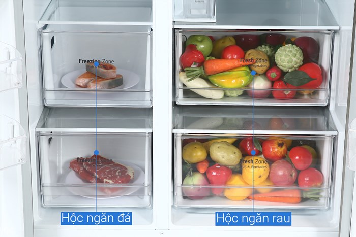 - Các ngăn trên cửa tủ, hộp ngăn kéo cùng khay kệ giúp tăng khả năng chứa thực phẩm.
